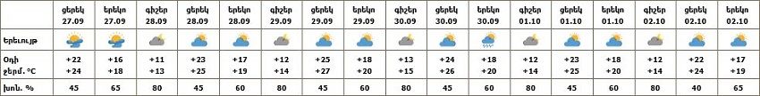 Հանրապետության տարածքում սեպտեմբերի 27-ի և 30-ի ցերեկը, 28-ի գիշերը, հոկտեմբերի 1-2-ի գիշերը և կեսօրից հետո առանձին շրջաններում սպասվում է անձրև։ Սեպտեմբերի 30-ին հնարավոր է նաև ամպրոպ: Սեպտեմբերի 27-30-ն առանձին շրջաններում հնարավոր է նաև մառախուղ։