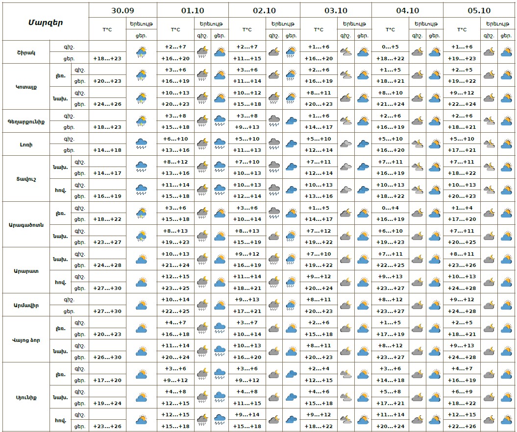 Սեպտեմբերի 30-ի ցերեկը, հոկտեմբերի 1-2-ը առանձին շրջաններում սպասվում է անձրև, հնարավոր է՝ նաև մառախուղ։ Սեպտեմբերի 30-ին առանձին շրջաններում հնարավոր է ամպրոպ: Հոկտեմբերի 3-5-ը սպասվում է առանց տեղումների եղանակ։