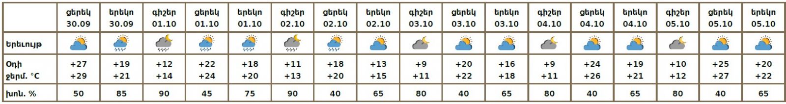 Երևանում սեպտեմբերի 30-ի երեկոյան ժամերին, հոկտեմբերի 1-2-ը հնարավոր է անձրև։ Հոկտեմբերի 3-5-ը սպասվում է առանց տեղումների եղանակ։
