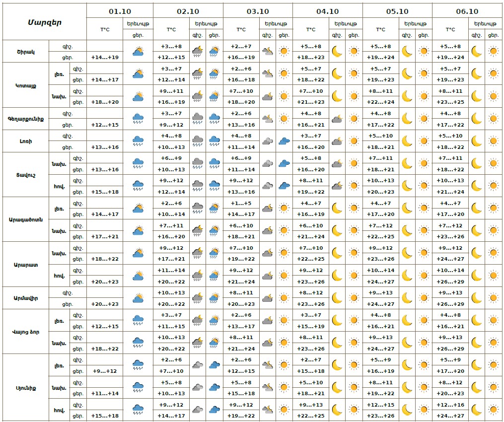 Քամին՝ արևմտյան՝ 2-5մ/վ։ Օդի ջերմաստիճանը հոկտեմբերի 1-ցերեկը, 2-ին աստիճանաբար կնվազի 5-8 աստիճանով, հոկտեմբերի 3-6-ին աստիճանաբար կբարձրանա 8-10 աստիճանով։