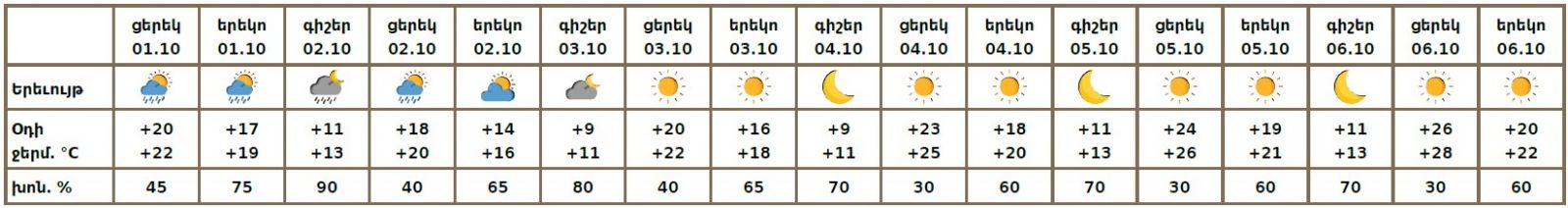 Հոկտեմբերի 1-ի ցերեկը, 2-ին առանձին շրջաններում սպասվում է անձրև, հնարավոր է նաև մառախուղ։ Հոկտեմբերի 3-6-ին սպասվում է առանց տեղումների եղանակ։