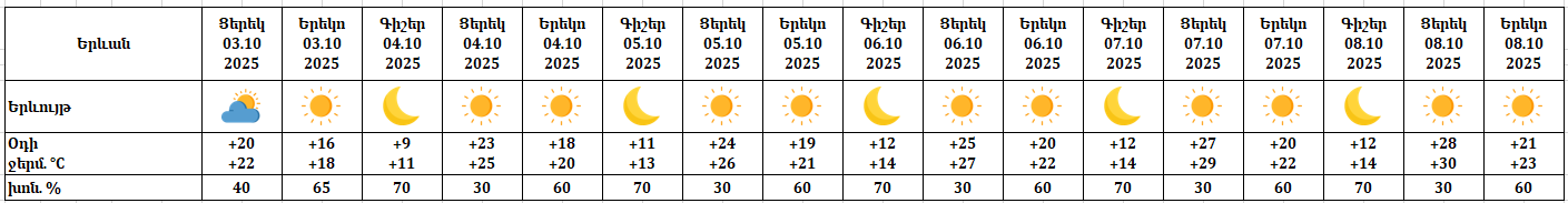 Երևան քաղաքում հոկտեմբերի 3-ի ցերեկը, 4-8-ը սպասվում է առանց տեղումների եղանակ։