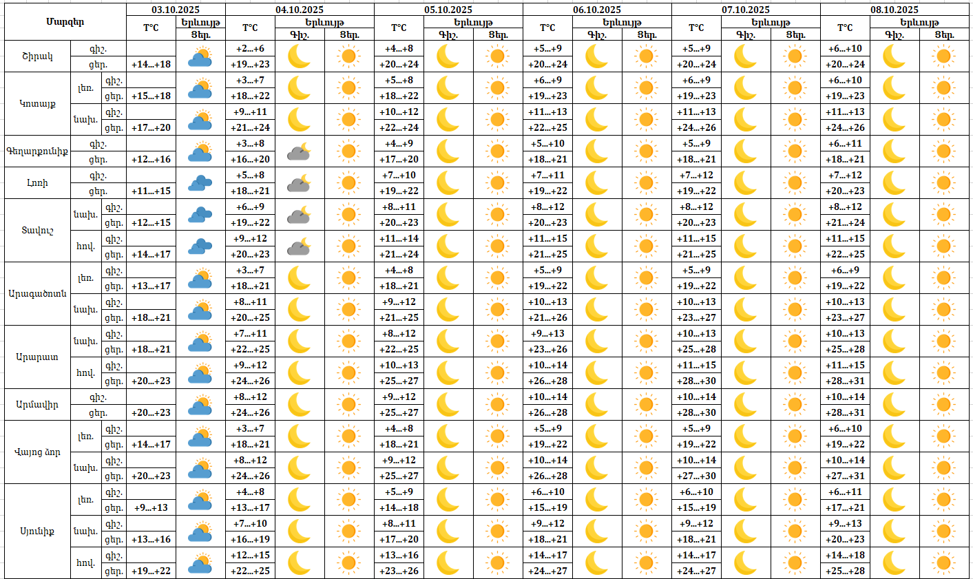 Հանրապետության տարածքում հոկտեմբերի 3-ի ցերեկը, 4-8-ը սպասվում է առանց տեղումների եղանակ։ Քամին՝ հարավ-արևմտյան՝ 2-5 մ/վ։ Օդի ջերմաստիճանը հոկտեմբերի 3-ի ցերեկը, 4-8-ը աստիճանաբար կբարձրանա 8-10 աստիճանով։