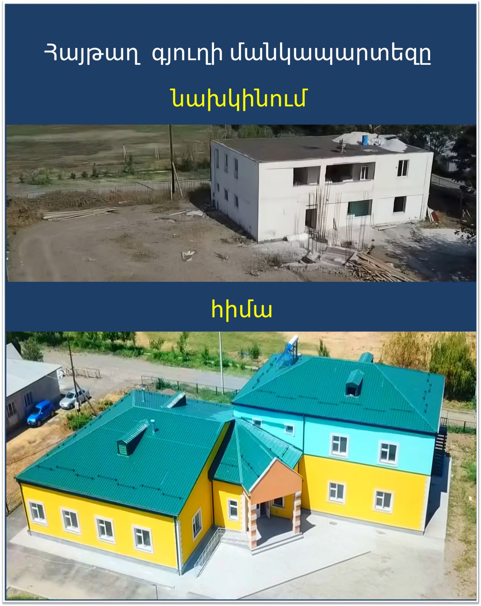 Հայաստանի Հանրապետության վարչապետի աշխատակազմի ղեկավարի տեղակալ Տարոն Չախոյանը Ֆեյսբուքի իր էջում հրապարակել է Հայթաղ գյուղի մանկապարտեզի շենքի լուսանկարը նախկինում և ներկայում: