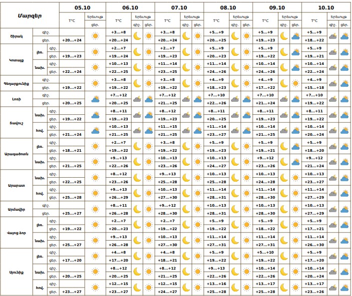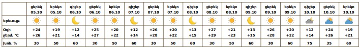 Օդի ջերմաստիճանը հոկտեմբերի 5-ի ցերեկը, 6-8-ին աստիճանաբար կբարձրանա ևս 2-3 աստիճանով: