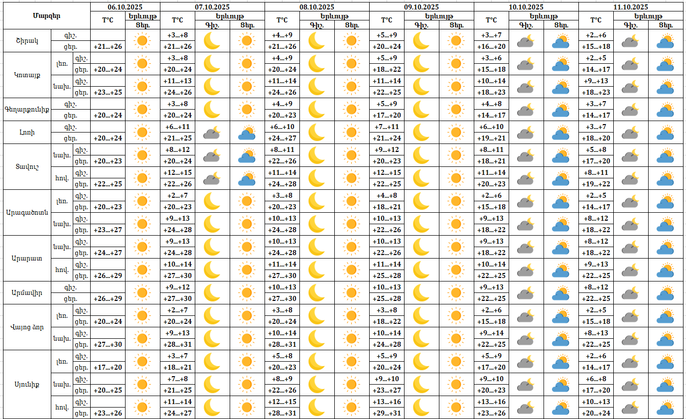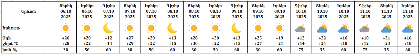 Օդի ջերմաստիճանը հոկտեմբերի 6-ի ցերեկը, 7-8-ը աստիճանաբար կբարձրանա ևս 2-3 աստիճանով: