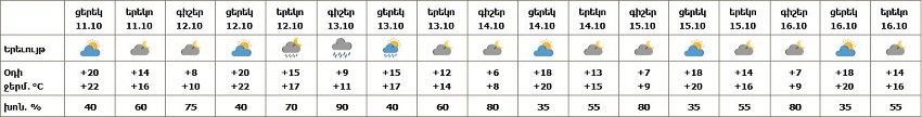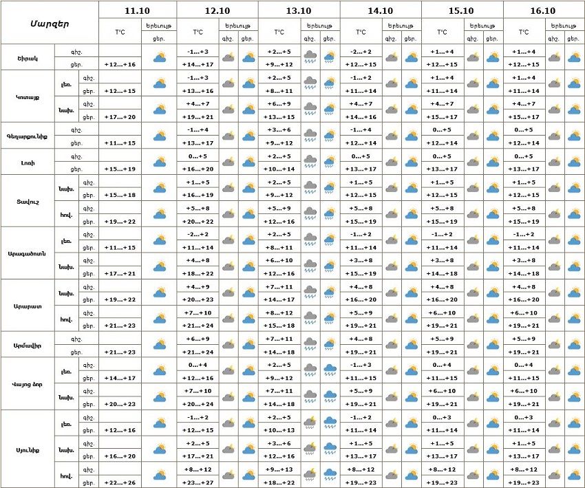 Հանրապետության տարածքում հոկտեմբերի 11-ի ցերեկը, 12-ի գիշերը, 14-16-ը սպասվում է առանց տեղումների եղանակ։ Հոկտեմբերի 12-ի երեկոյան առանձին շրջաններում, 13-ին շրջանների մեծ մասում սպասվում է անձրև։