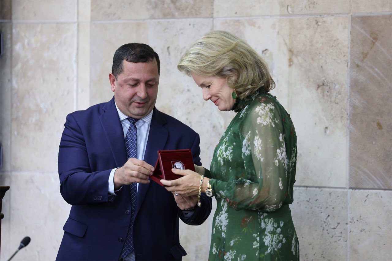 Երևանի պետական համալսարանում կայացած հանդիպման ընթացքում Հովհաննես Հովհաննիսյանը համալսարանի ուսանողների, դասախոսների, ինչպես նաև աշխատակիցների անունից Բելգիայի թագուհուն հանձնել է ԵՊՀ հիմնադրման 100-ամյակի հուշադրամ։