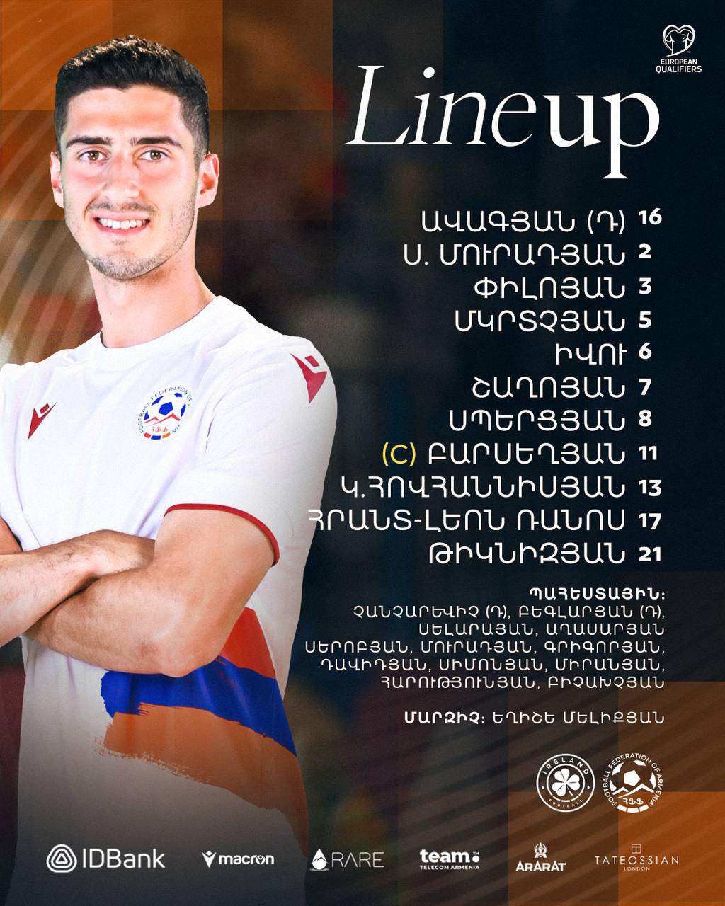 Հայաստանի ֆուտբոլի ֆեդերացիան հրապարակել է նաև հավաքականի մեկնարկային կազմն Իռլանդիայի դեմ խաղում։