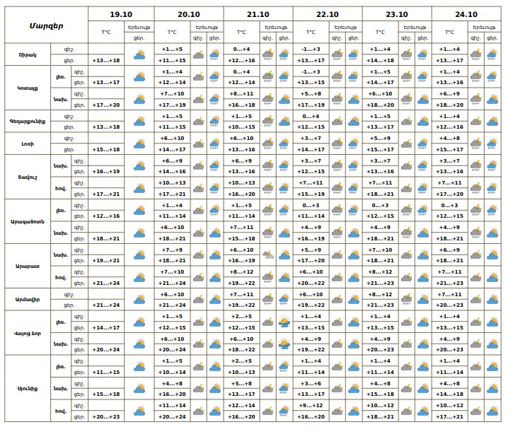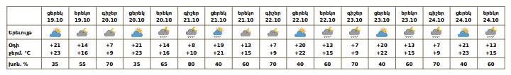 Հոկտեմբերի 20-ին կեսօրից հետո, 21-24-ին առանձին շրջաններում սպասվում է կարճատև անձրև։ Քամին արևմտյան՝ 2-5մ/վ, հոկտեմբերի 21-ին առանձին շրջաններում հնարավոր է քամու ուժգնացում՝ 16-19 մ/վ արագությամբ։