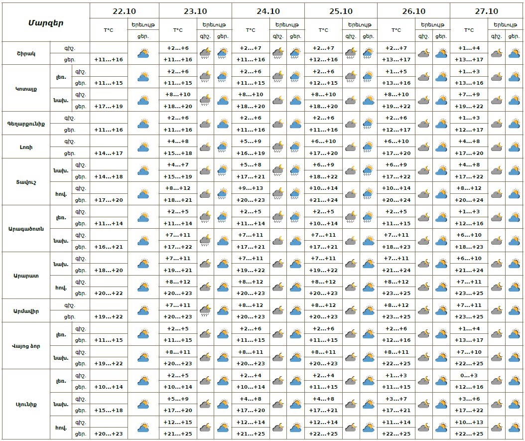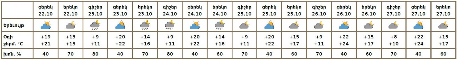 Քամին արևմտյան՝ 2-5 մ/վ: Օդի ջերմաստիճանը հոկտեմբերի 22-ի ցերեկը, 23-ին կբարձրանա 3-5 աստիճանով։