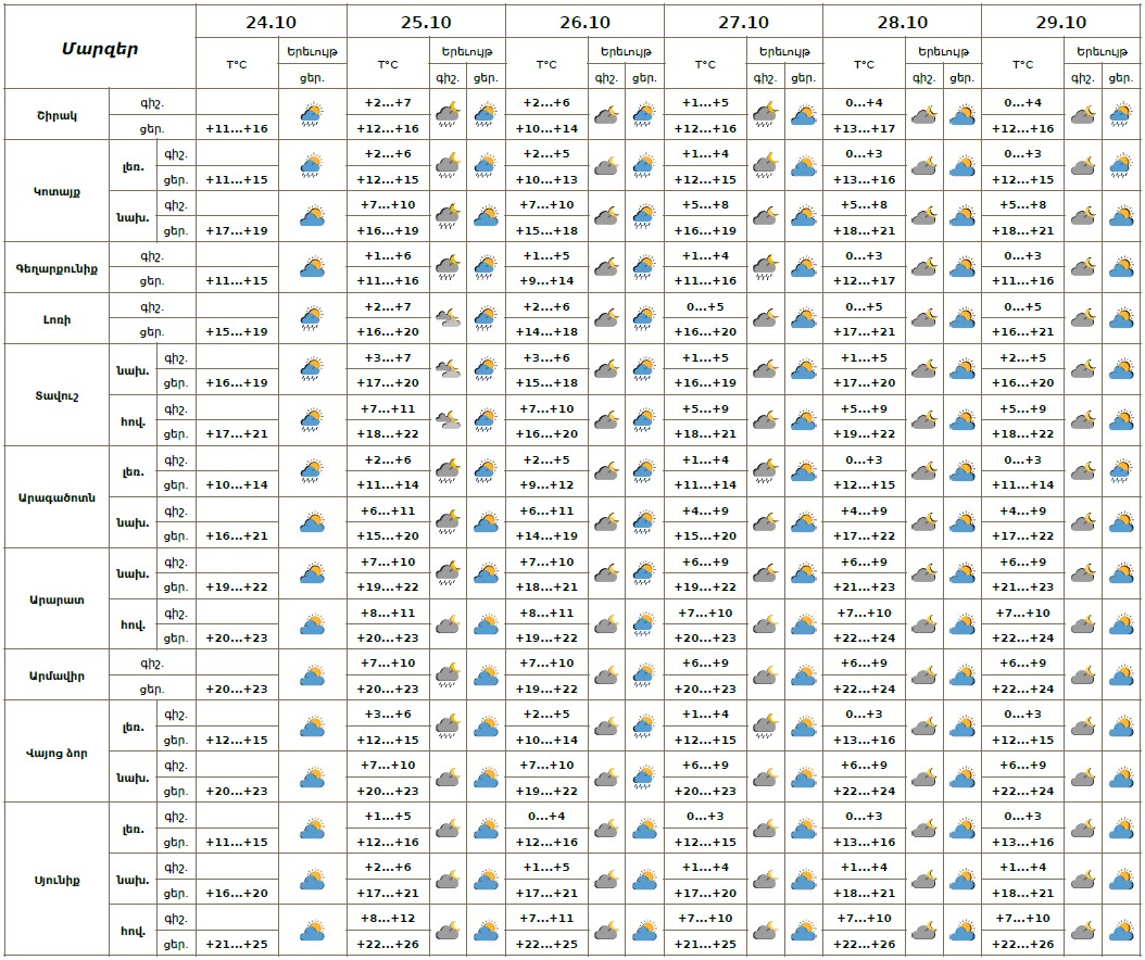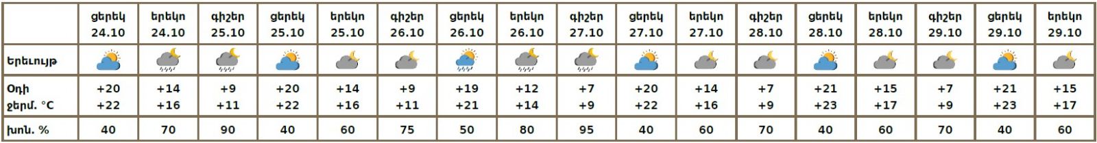 Երևանում հոկտեմբերի 24-ի երեկոյան ժամերին, 25-ի գիշերը, 26-ին, 27-ի գիշերը սպասվում է կարճատև անձրև։ Հոկտեմբերի 25-ի և 27-ի ցերեկը, 28-29-ը սպասվում է առանց տեղումների եղանակ։