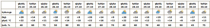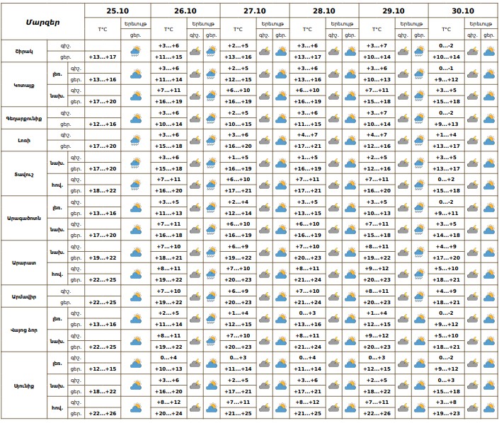 Երևանում հոկտեմբերի 25-ի ցերեկը, 27-28-ը և 30-ին սպասվում է առանց տեղումների եղանակ։