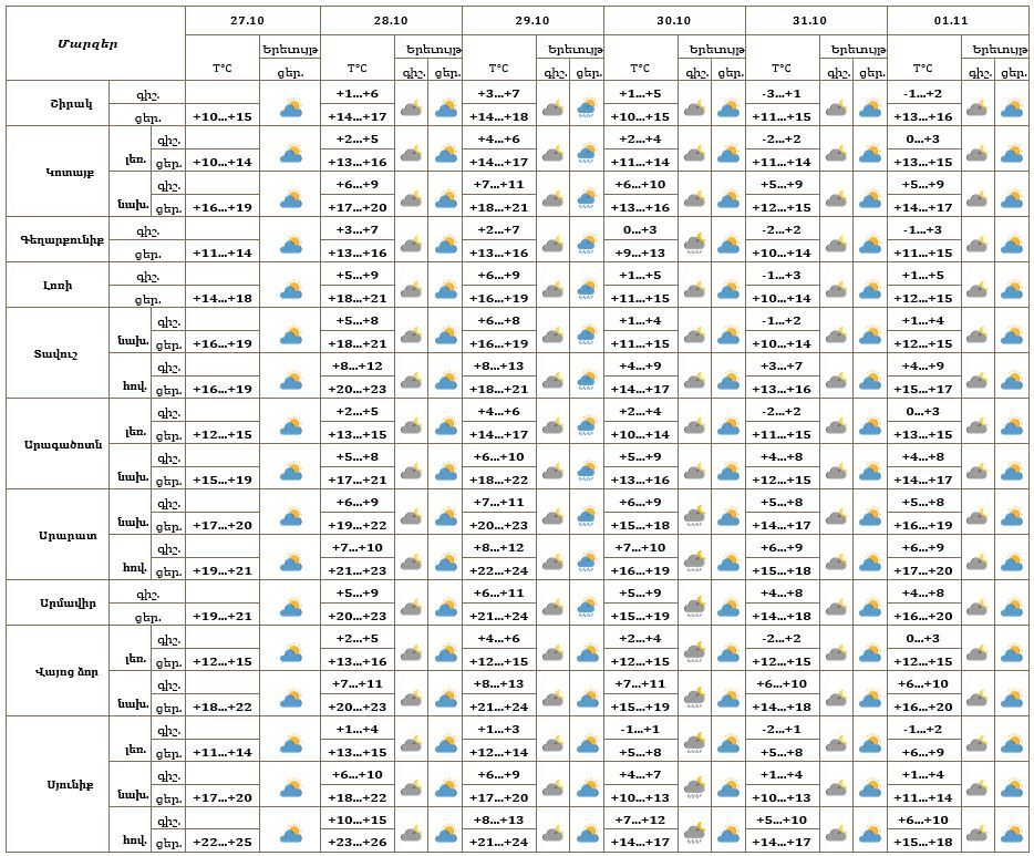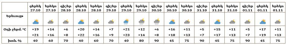 Հանրապետության տարածքում հոկտեմբերի 27-ի ցերեկը, 28-ին, 31-ին, նոյեմբերի 1-ին սպասվում է առանց տեղումների եղանակ: Հոկտեմբերի 29-ի ցերեկը, 30-ի գիշերն առանձին շրջաններում սպասվում է անձրև։