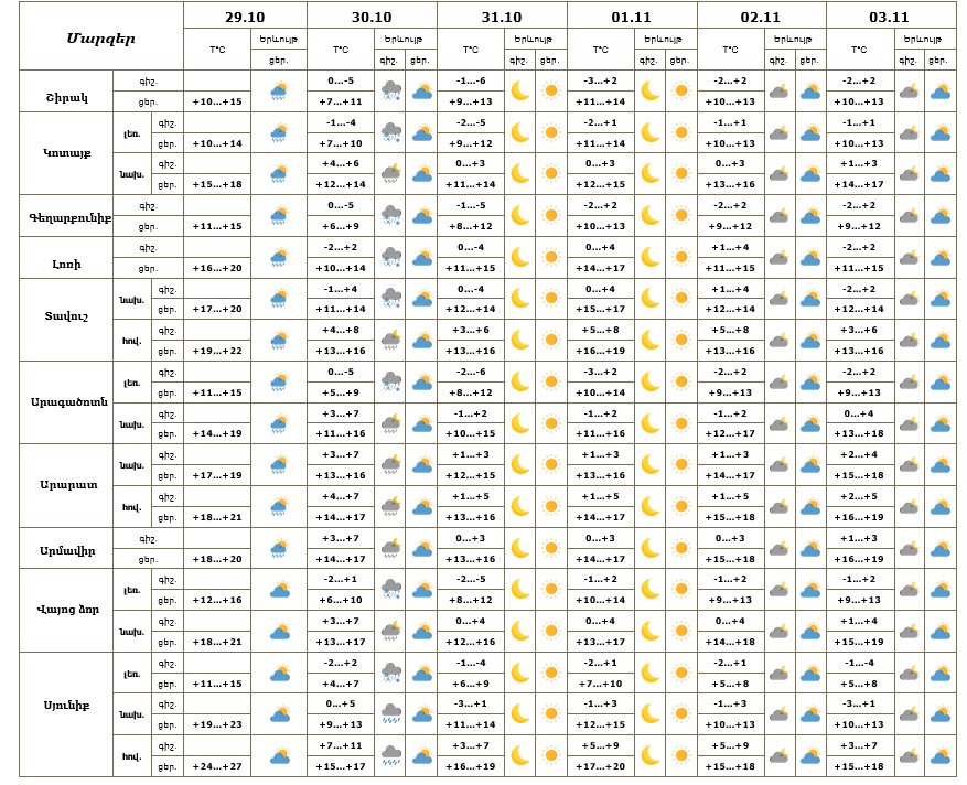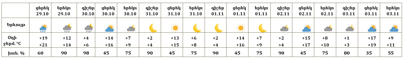 Հանրապետության տարածքում հոկտեմբերի 29-ի ցերեկն առանձին շրջաններում, 30-ի գիշերը շրջանների զգալի մասում սպասվում են տեղումներ, լեռնային շրջաններում՝ թաց ձյան, հովտային շրջաններում՝ անձրևի տեսքով։ Առանձին վայրերում տեղումները կլինեն հորդառատ: Հոկտեմբերի 30-ի ցերեկը, 31-ին, նոյեմբերի 1-3-ը սպասվում է առանց տեղումների եղանակ: