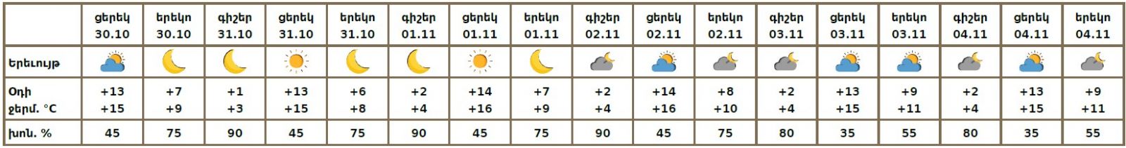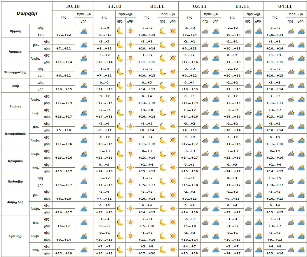 Օդի ջերմաստիճանը հոկտեմբերի 30-ի ցերեկը կնվազի ևս 3-5 աստիճանով, նոյեմբերի 1-2-ին աստիճանաբար կբարձրանա 2-3 աստիճանով։