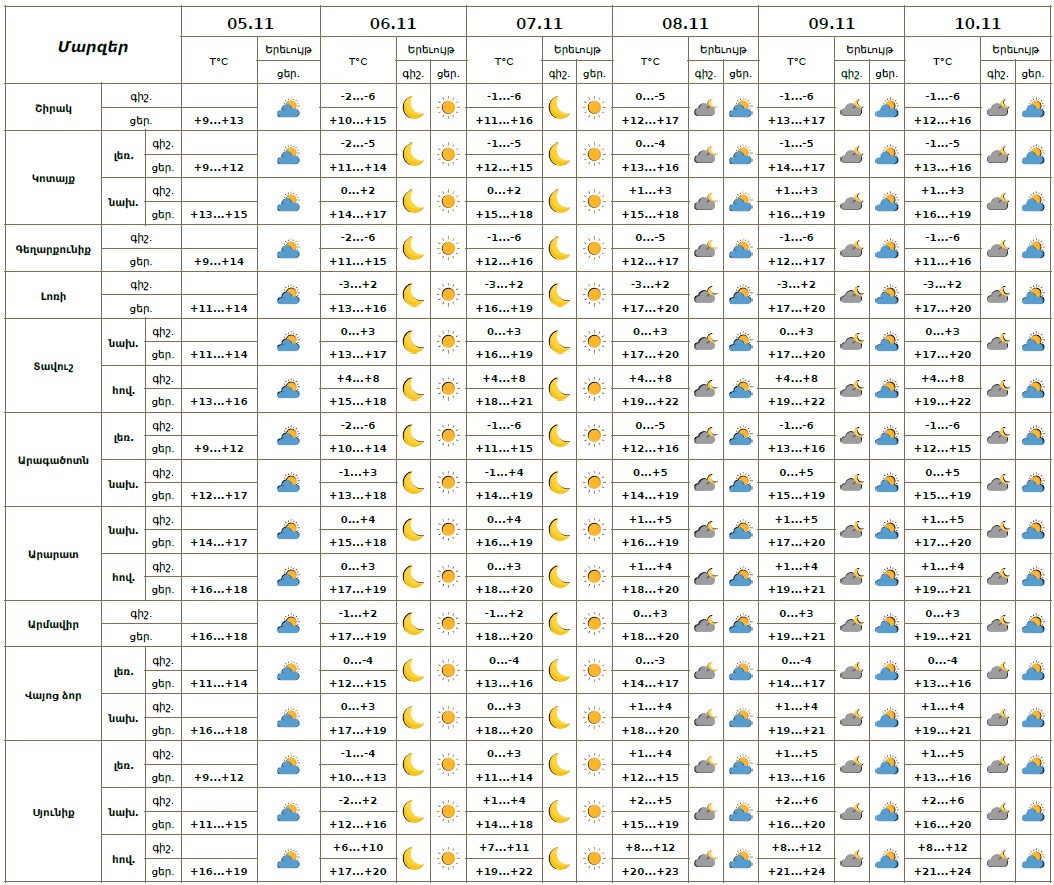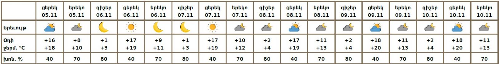 Նոյեմբերի 5-ի ցերեկը, նոյեմբերի 6-10-ին սպասվում է առանց տեղումների եղանակ: Քամին hարավարևմտյան՝ 2-5մ/վ: