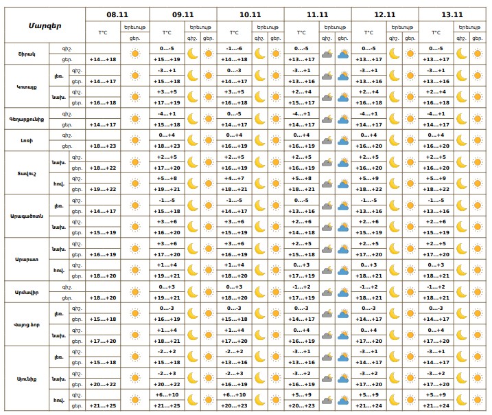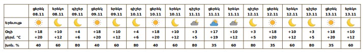 Հանրապետության տարածքում նոյեմբերի 8-ի ցերեկը, 9-13-ը սպասվում է առանց տեղումների եղանակ: Քամին՝ հարավարևմտյան, 2-5 մ/վ: