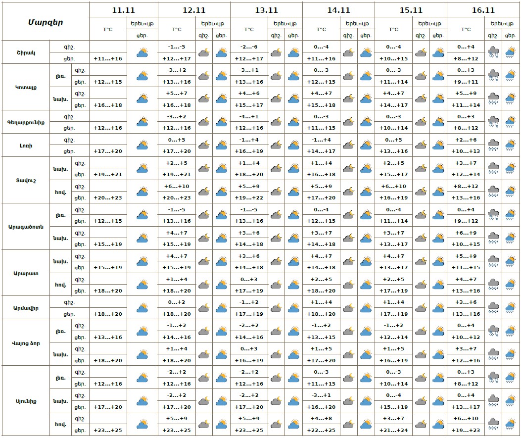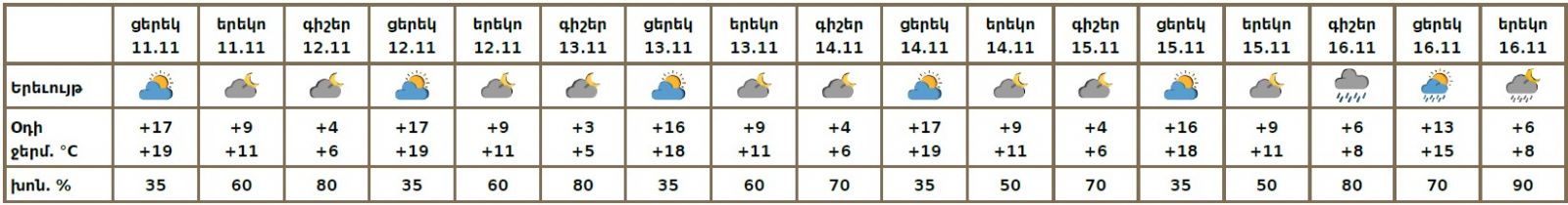 Նոյեմբերի 11-ի ցերեկը, 12-15-ը հանրապետությունում սպասվում է առանց տեղումների եղանակ: Նոյեմբերի 16-ին շրջանների զգալի մասում սպասվում են տեղումներ, գիշերը լեռնային գոտիներում՝ ձնախառն անձրևի տեսքով։