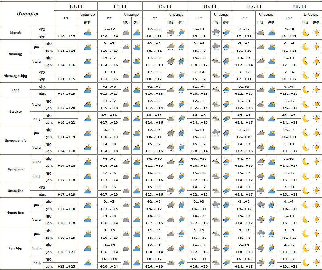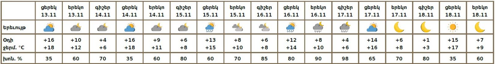 Նոյեմբերի 14-ին, 18-ին հանրապետությունում սպասվում է առանց տեղումների եղանակ: Նոյեմբերի 15-17-ը առանձին շրջաններում սպասվում են կարճատև տեղումներ, գիշերը լեռնային գոտիներում՝ ձնախառն անձրևի տեսքով։ Քամին՝ հարավարևմտյան, 2-5 մ/վ: