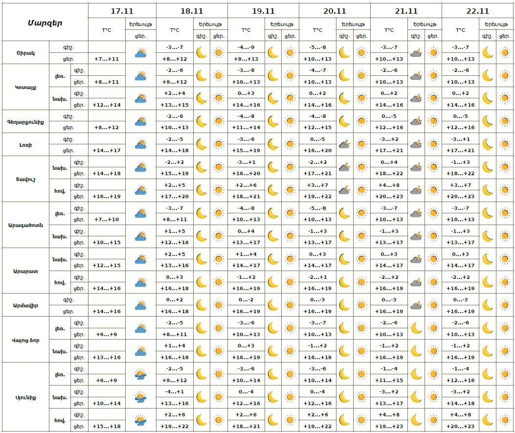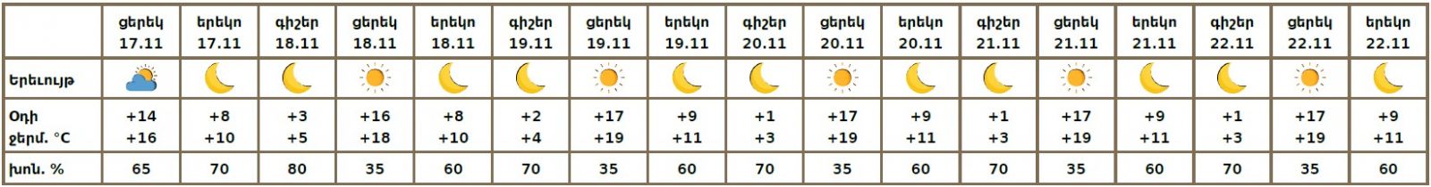 Նոյեմբերի 17-ի ցերեկը, 18-22-ը հանրապետությունում սպասվում է առանց տեղումների եղանակ, լուսադեմին Արարատյան դաշտում սպասվում է կարճատև մառախուղ: Քամին՝ հարավարևմտյան՝ 2-5 մ/վ: