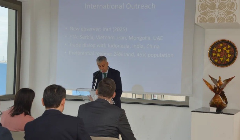 Ներկայացնելով ՀՀ վարչապետի նախաձեռնած «Խաղաղության խաչմերուկ» նախագիծը՝ մշտական ներկայացուցիչ Վ.Կարապետյանը նշել է, որ տրանսպորտային ենթակառուցվածքների դիվերսիֆիկացումն աներկբայորեն կամրապնդի արտահանումը և առևտուրը ԵԱՏՄ շրջանակներում:
