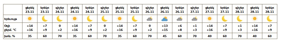 Օդի ջերմաստիճանը նոյեմբերի 23-ի ցերեկը կբարձրանա ևս 1-2 աստիճանով, այնուհետև Էապես չի փոխվի։