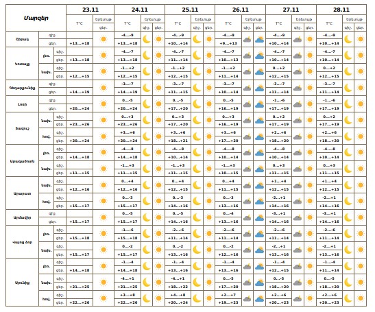 Հանրապետության տարածքում նոյեմբերի 23-ի ցերեկը, 24-28-ին սպասվում է առանց տեղումների եղանակ, լուսադեմին Արարատյան և Շիրակի դաշտում սպասվում է կարճատև մառախուղ: