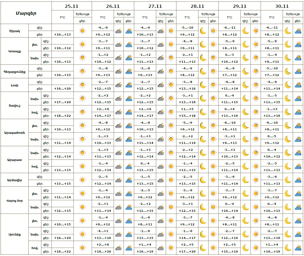 Նոյեմբերի 25-ի ցերեկը, 26-30-ը սպասվում է առանց տեղումների եղանակ, լուսադեմին Արարատյան և Շիրակի դաշտում սպասվում է կարճատև մառախուղ: