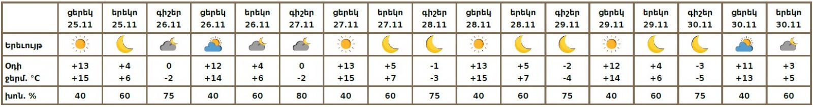 Օդի ջերմաստիճանը նոյեմբերի 25-26-ի ցերեկը աստիճանաբար կնվազի 2-4 աստիճանով, այնուհետև էապես չի փոխվի։