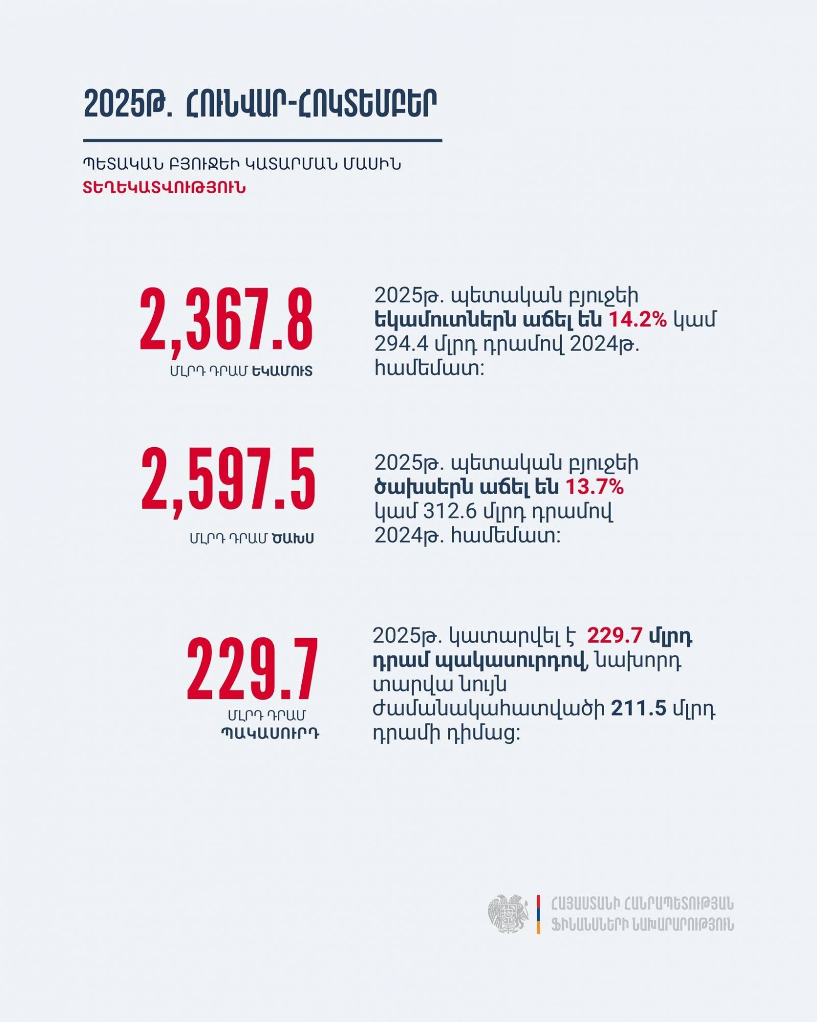 2025 թվականի հունվար-հոկտեմբեր ամիսների ընթացքում ՀՀ պետական բյուջեն կատարվել է 229.7 մլրդ դրամ պակասուրդով՝ նախորդ տարվա նույն ժամանակահատվածի 211.5 մլրդ դրամի դիմաց: