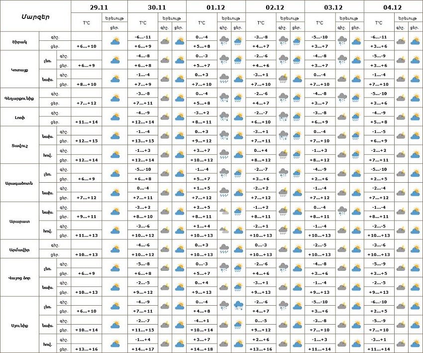 Հանրապետության տարածքում նոյեմբերի 29-ի ցերեկը, 30-ին, դեկտեմբերի 4-ին սպասվում է առանց տեղումների եղանակ։