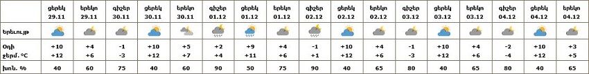 Երևան քաղաքում նոյեմբերի 29-ի ցերեկը, 30-ին, դեկտեմբերի 2-ի ցերեկը, 3-4-ը սպասվում է առանց տեղումների եղանակ։