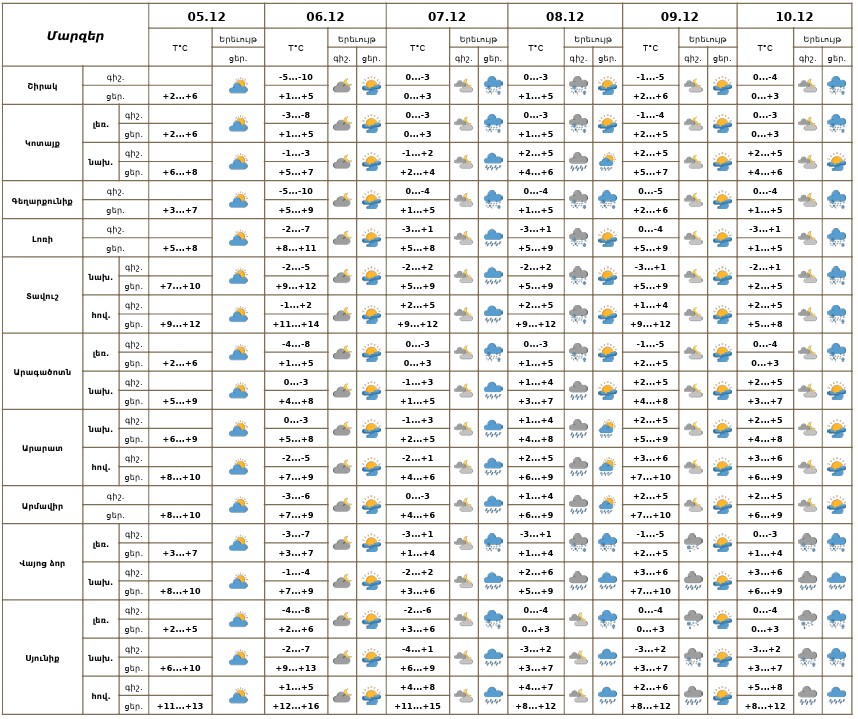 Դեկտեմբերի 5-ի և 9-ի ցերեկը, 6-ին, 7-ի գիշերը սպասվում է առանց տեղումների եղանակ։ Դեկտեմբերի 7-ի ցերեկը շրջանների զգալի մասում, 8-ին, 9-ի գիշերը, 10-ին առանձին շրջաններում սպասվում են տեղումներ՝ լեռնային շրջաններում ձյան և ձնախառն անձրևի, հովտային շրջաններում՝ անձրևի տեսքով: Դեկտեմբերի 5-8-ը Արարատյան և Շիրակի դաշտի ցածրադիր հատվածներում առավոտյան ժամերին սպասվում է մառախուղ։