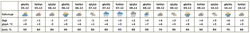 Երևանում դեկտեմբերի 5-ի ցերեկը, 6-ին, 7-ի գիշերը և 9-10-ը սպասվում է առանց տեղումների եղանակ։ Դեկտեմբերի 7-ի ցերեկը, 8-ին սպասվում է անձրև։