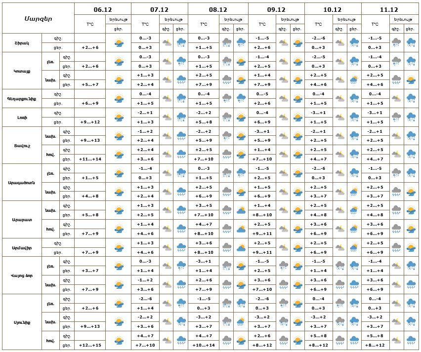 Օդի ջերմաստիճանը դեկտեմբերի 7-ի ցերեկը կնվազի 2-3, Լոռիում, Տավուշում, Սյունիքում՝ 5-7 աստիճանով, դեկտեմբերի 8-9-ի ցերեկն աստիճանաբար կբարձրանա 3-4 աստիճանով: