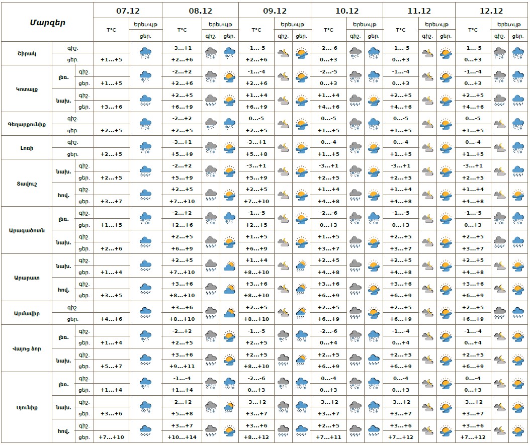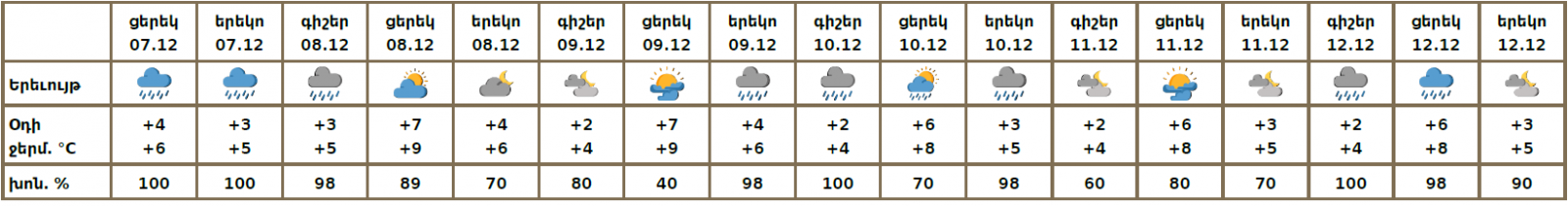 Երևանում՝ դեկտեմբերի 7-ի ցերեկը, 8-ի գիշերը, 9-ի երեկոյան, 10-ին, 12-ին սպասվում է անձրև։ Դեկտեմբերի 8-ի ցերեկը, 9-ի գիշերը, 11- ին սպասվում է առանց տեղումների եղանակ։