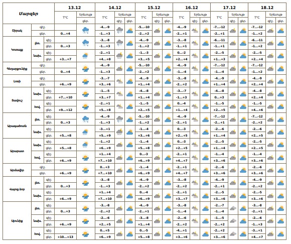 Դեկտեմբերի 13-ի ցերեկը, 14-ի գիշերը Շիրակի, Լոռու, Տավուշի, Գեղարքունիքի և Սյունիքի մարզերի առանձին հատվածներում սպասվում է քամու ուժգնացում՝ 18-22 մ/վ արագությամբ։
