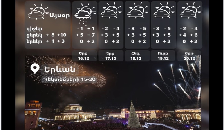 Երևանում դեկտեմբերի 15-ի ցերեկը, 17-20-ը սպասվում է առանց տեղումների եղանակ։