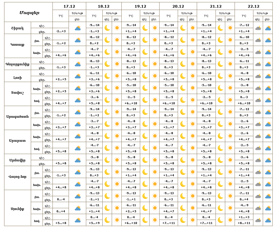 Մարզերում դեկտեմբերի 17-ի ցերեկը, 18-22-ը սպասվում է առանց տեղումների եղանակ։