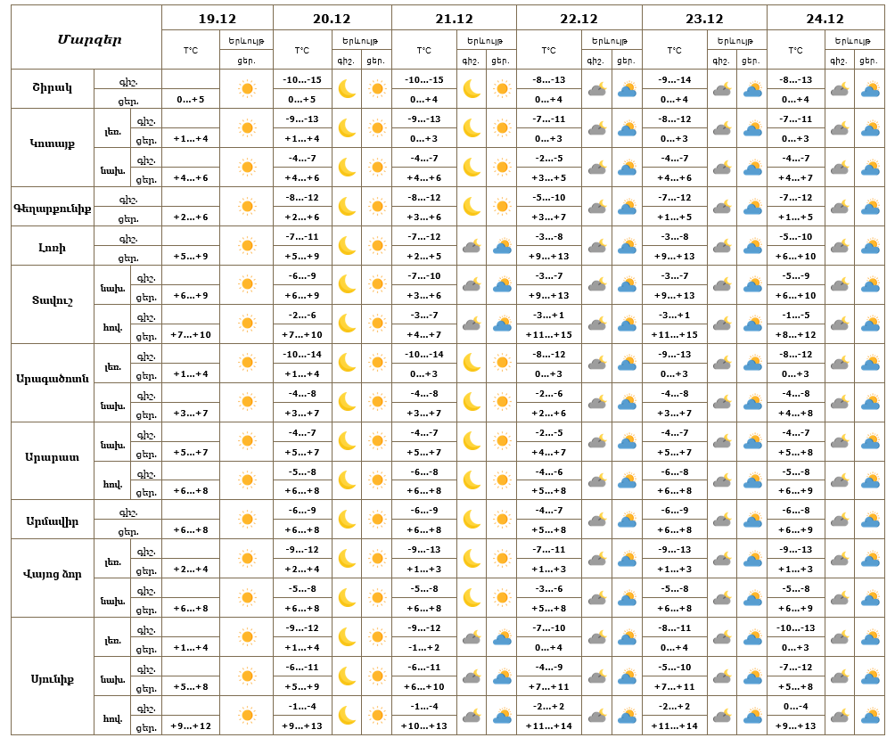Մարզերում դեկտեմբերի 19-ի ցերեկը, 20-24-ը սպասվում է առանց տեղումների եղանակ։