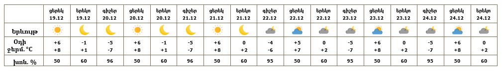 Երևանում դեկտեմբերի 19-ի ցերեկը, 20-24-ը սպասվում է առանց տեղումների եղանակ։