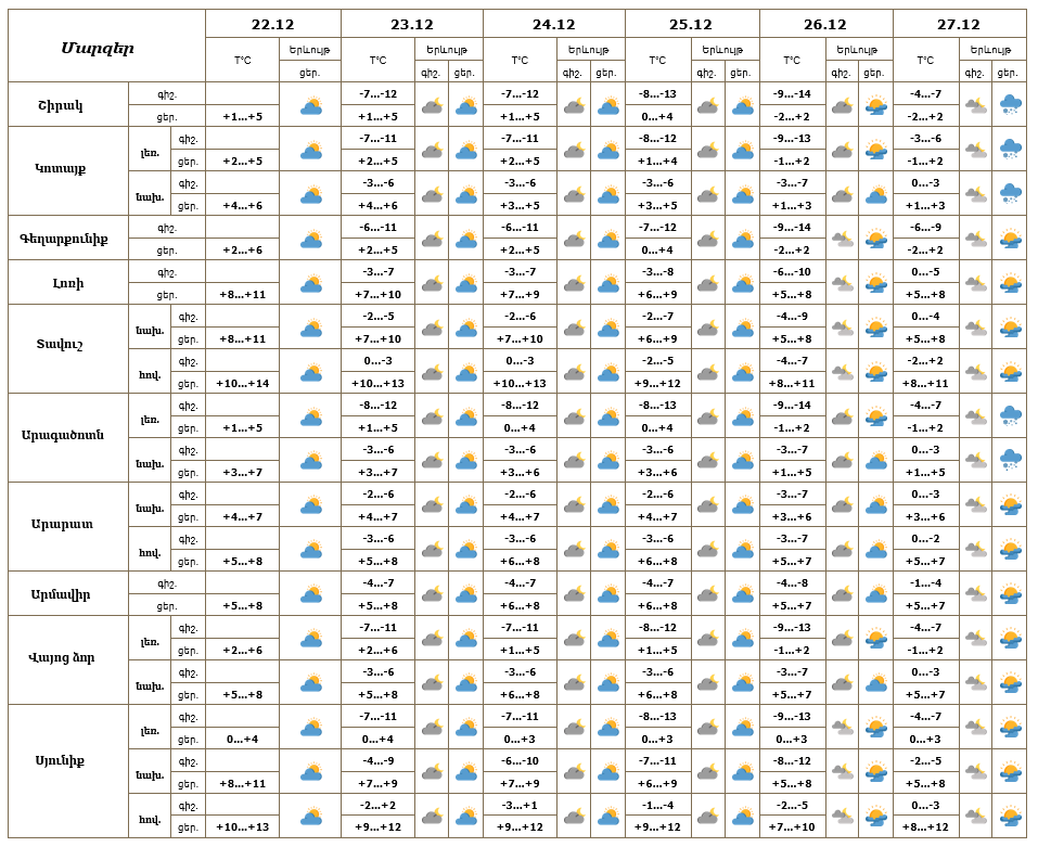 Հանրապետության տարածքում դեկտեմբերի 22-ի ցերեկը, 23-26-ը սպասվում է առանց տեղումների եղանակ։ Դեկտեմբերի 27-ին առանձին վայրերում սպասվում է ձյուն։