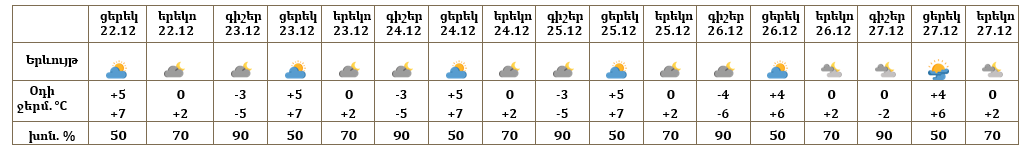 Երևան քաղաքում դեկտեմբերի 22-ի ցերեկը, 23-27-ը սպասվում է առանց տեղումների եղանակ։