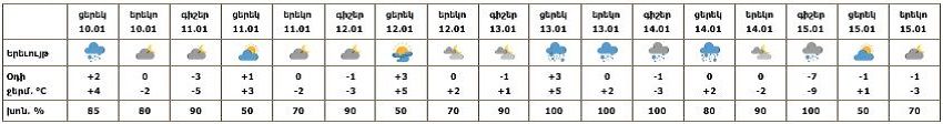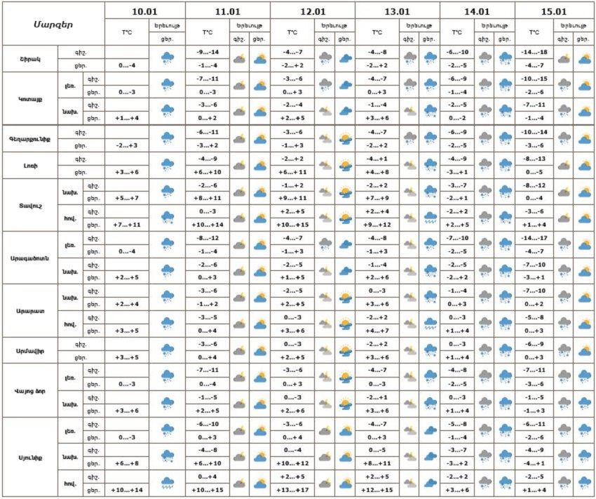 Հանրապետության տարածքում հունվարի 10-ի ցերեկը, 12-ի գիշերը և առավոտյան, 13-15-ը առանձին շրջաններում սպասվում է ձյուն։