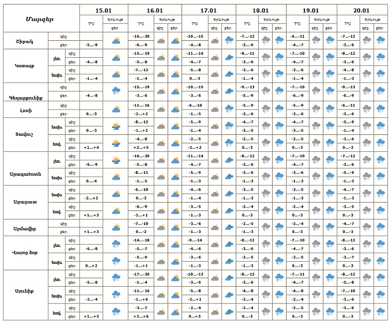 Օդի ջերմաստիճանը հունվարի 15-ի ցերեկը, 16-ին կնվազի ևս 4-6 աստիճանով, 17-19-ի գիշերային ժամերին աստիճանաբար կբարձրանա 7-10 աստիճանով։