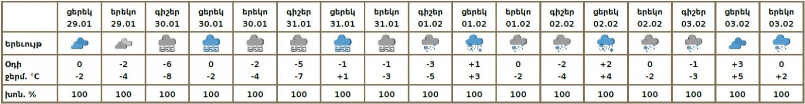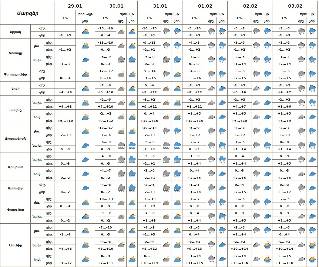 Օդի ջերմաստիճանը հունվարի 29-31-ի ցերեկային ժամերին Լոռիում, Տավուշում և Սյունիքում աստիճանաբար կբարձրանա 5-7 աստիճանով։