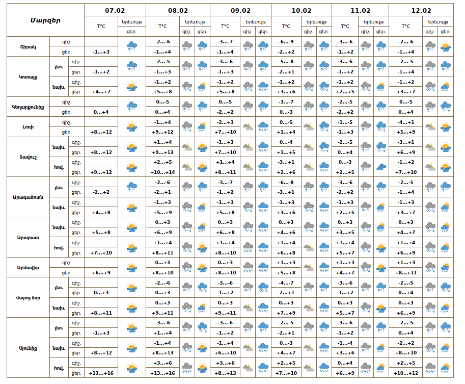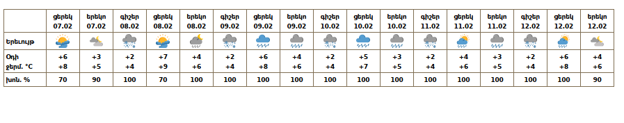 Օդի ջերմաստիճանը փետրվարի 7-ի ցերեկը, 8-ին կբարձրանա 4-6 աստիճանով, փետրվարի 10-11-ին ցերեկային ժամերին աստիճանաբար կնվազի 3-5 աստիճանով։