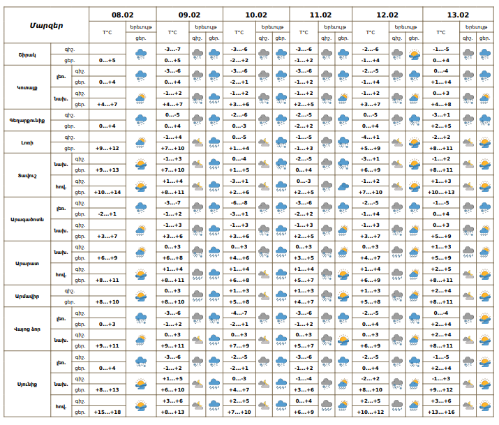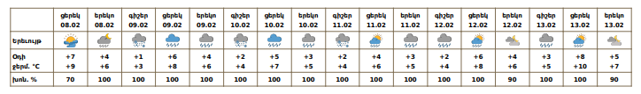 Հանրապետության տարածքում փետրվարի 8-ի ցերեկը, 9-13-ին առանձին շրջաններում սպասվում են տեղումներ, նախալեռնային և հովտային շրջաններում՝ ձնախառն անձրևի և անձրևի, լեռնային շրջաններում ձյան տեսքով, լեռնային առանձին շրջաններում սպասվում է բուք, ցածր հորիզոնական տեսանելիություն։