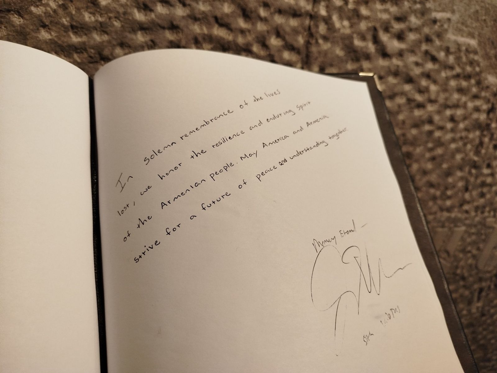 Այցի ավարտին ԱՄՆ փոխնախագահը գրառում է կատարել Հայոց ցեղասպանության թանգարանի Պատվավոր հյուրերի հուշամատյանում, նշելով՝ «Կորցրած կյանքերի հանդեպ խորին հարգանքի հիշատակով մենք պատվում ենք հայ ժողովրդի տոկունությունն ու անսասան ոգին։ Թող Ամերիկան և Հայաստանը միասին ձգտեն խաղաղության և փոխըմբռնման ապագայի»: